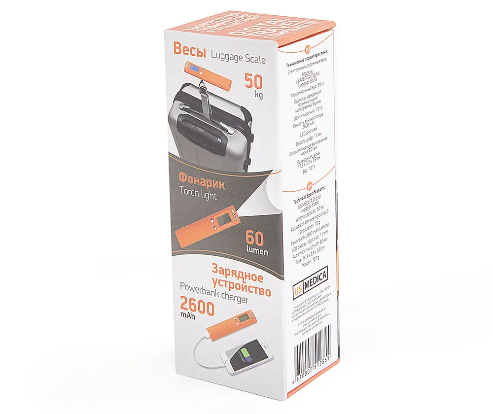 Электронные дорожные весы US MEDICA– практичное и современное цифровое устройство, которое станет незаменимым помощником во время отдыха или повседневной жизни. Компактный  размер и малый вес позволяют брать прибор куда угодно. Устройство совмещает в себе сразу 3 функции: весы для взвешивания багажа, портативный внешний аккумулятор (Power Bank) и фонарик.